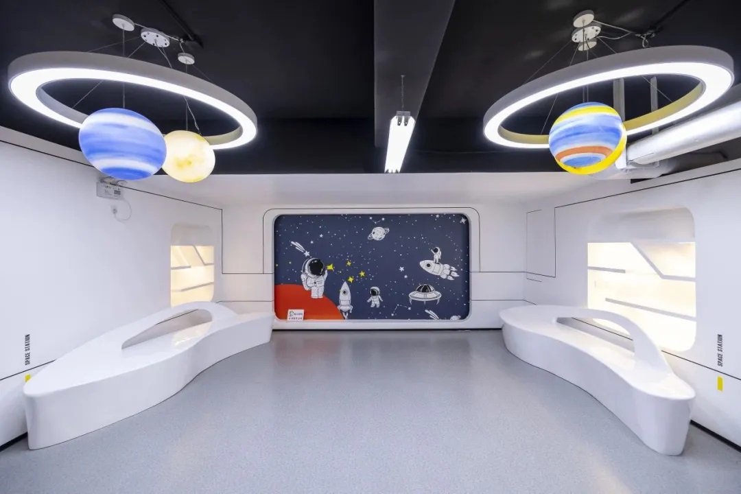 2024年2月,学校在地下车库创建主题科创实验室,完成“万里城太空站”的整体改造工程。整个空间划分为运动区、实验区、多功能活动区、特色展示区等,进一步优化了环境布局。