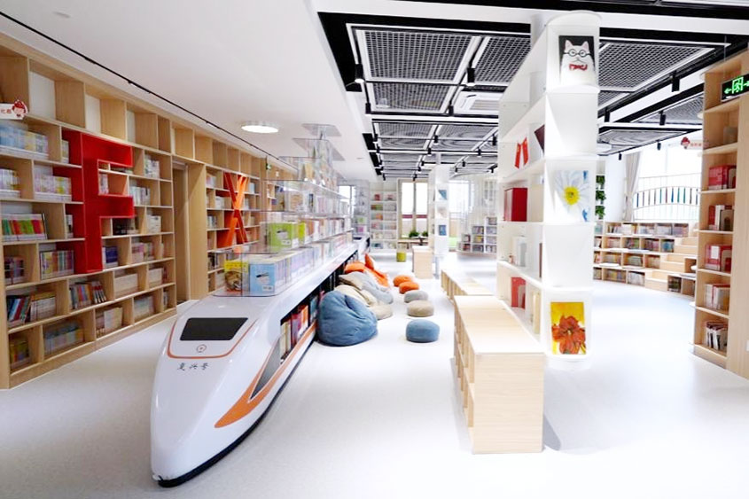 新图书馆敞亮、现代又萌趣:墙面 “复小兴”IP形象活力四射,“复兴号”列车书架充满童趣与科技感。整体设计既融入了校园特色文化,又满足了孩子们的真实需求。