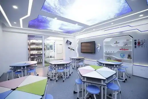 三营,即预备营、操作营、互动营:空间布局灵活开放、功能多元,支持工具收纳和展成、实践操作和实验、整班讲授和分组、成果展示和交流等多种学习活动场景。巢与巢之间使用移门隔断,桌椅排布离合如一,当多门课程进行同一主题的跨学科项目化学习时,空间可以联通、组合,实现综合学习的“融而有序”。
