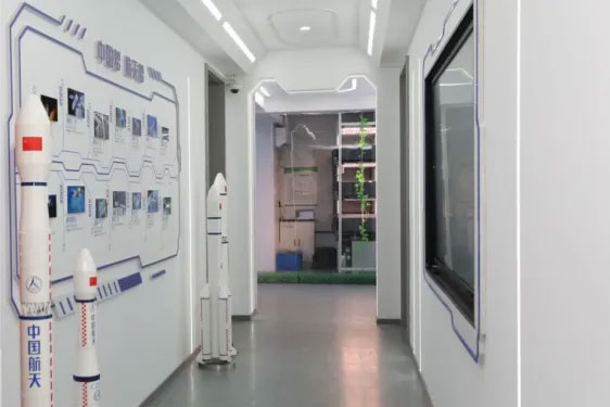 一廊,即科创主题长廊:中国航天人的光辉历程通过微展和模型依次排列,追随航天人的脚步聆听来自宇宙中遥远的声音;点击互动触摸电脑,开启探索奥秘的智慧之钥。