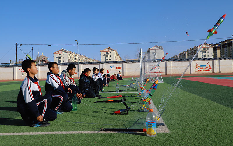 “三二一,发射!”几道银亮的水柱在空中划出优美的抛物线,“嗖嗖”的破空声后,水火箭拖着彩虹般的尾迹直冲云霄。最高的那支箭久久不落,引来一片欢呼……甘肃省瓜州县张芝小学的科技教育,也在这一声声欢呼中变得具体而生动。